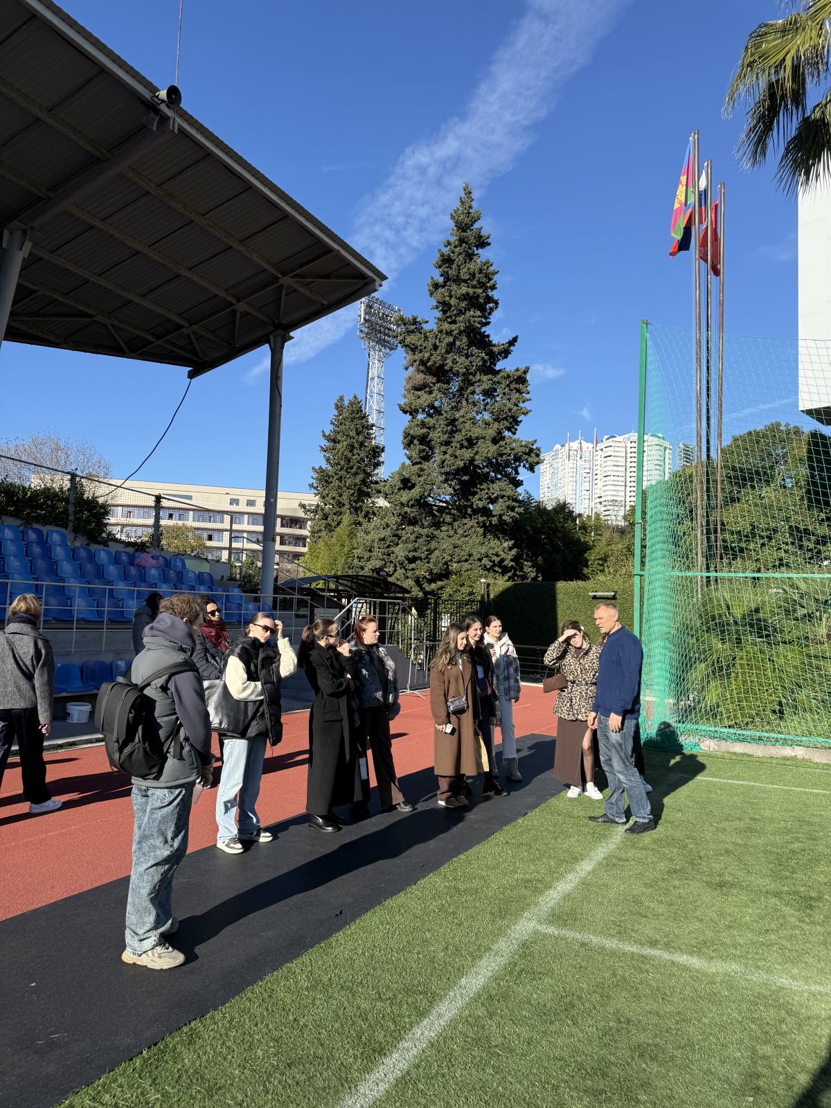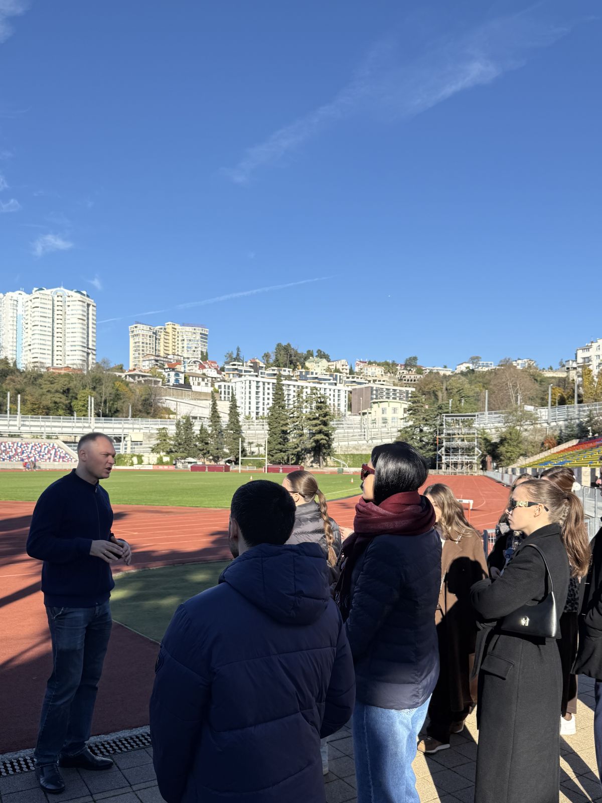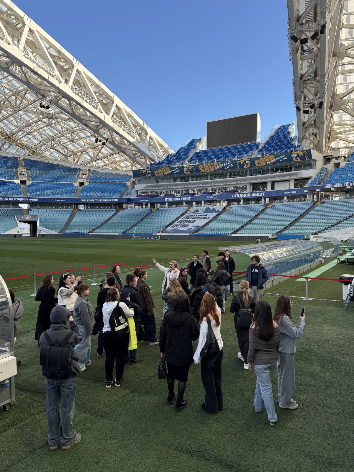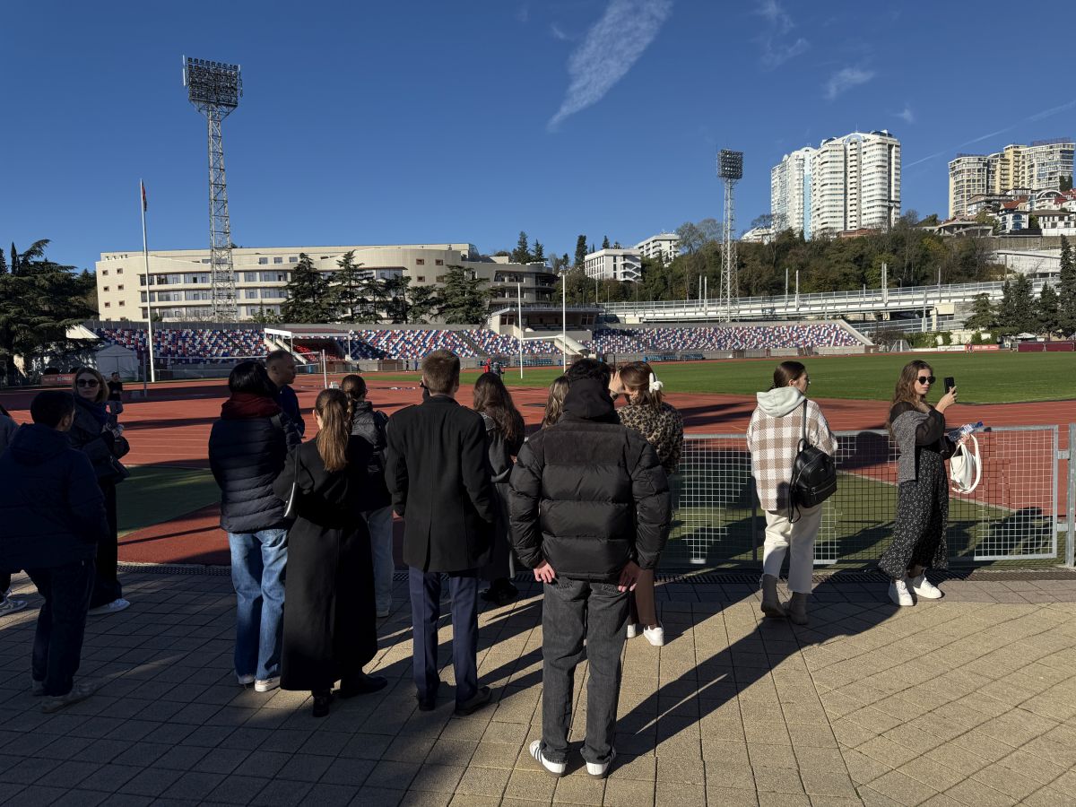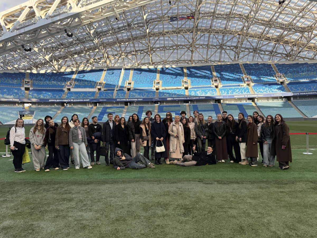 Лекция на поле стадиона «Фишт», ставшего легендарным после проведения на нем Олимпийских игр в 2014 году, — само по себе запоминающееся событие. «Мы смотрели Олимпиаду по телевизору, когда учились в школе, а теперь ходим по полю того самого стадиона. Это здорово!» — отметил один из бакалавров.